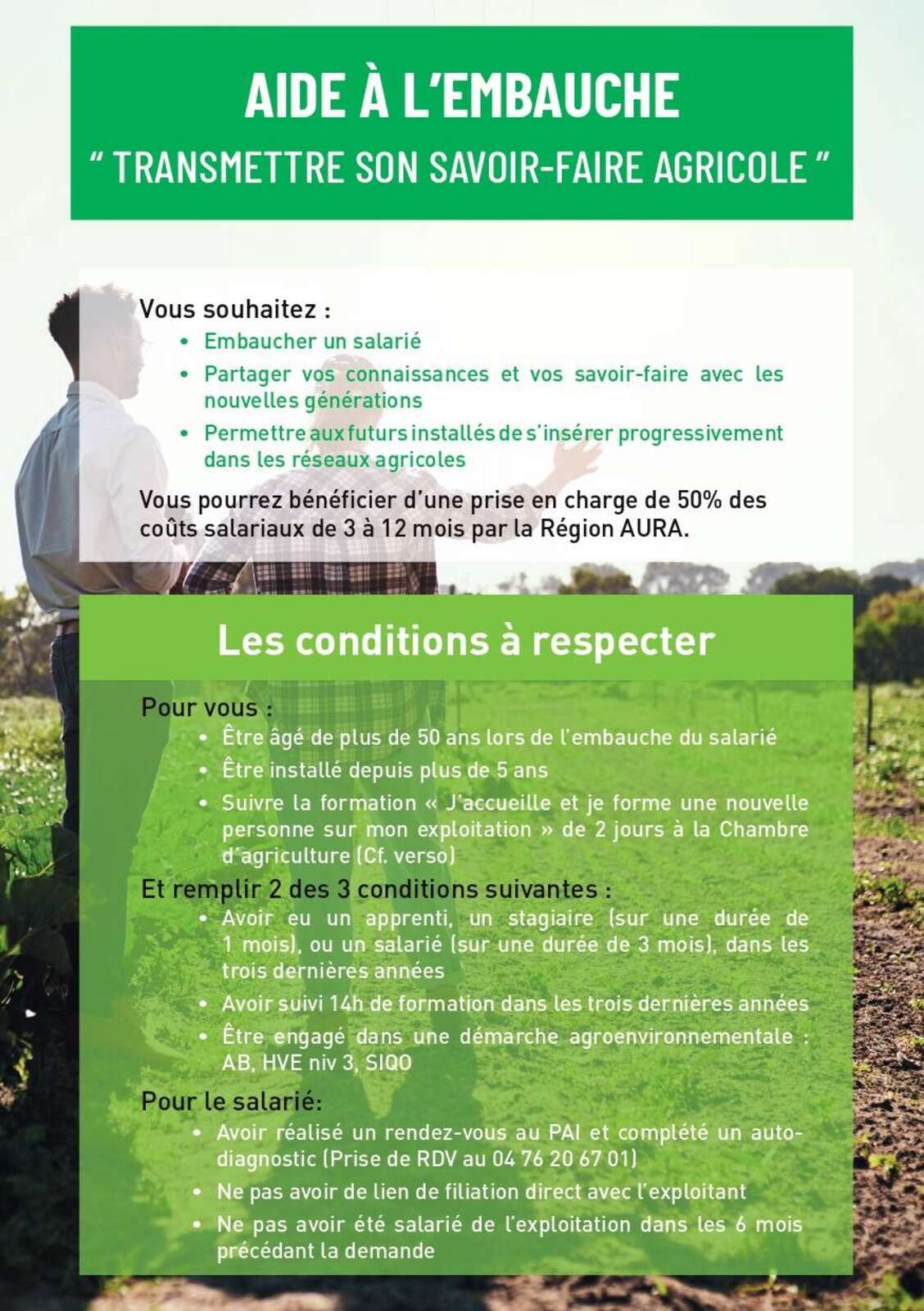 La région Auvergne Rhône Alpes et la Chambre d'Agriculture de l'Isère facillitent l'embauche de votre salarié(e) via un Groupement d'Employeurs dans le cadre du dispositif "Transmettre son savoir-faire agricole". Une prise en charge jusqu'à 50% des coûts salariaux par la région est possible si certaines conditions sont réunies (cliquez sur l'image ci-contre pour l'agrandir).